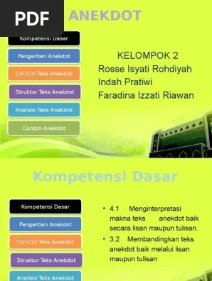 Adalah cerita singkat dan lucu atau menarik, yang menggambarkan kejadian atau . Sedangkan teks anekdot merupakan cerita rekaan yang tidak harus berdasarkan pada keyataan yang terjadi di masyarakat atau bisa juga terinspirasi dari kejadian . Anekdot adalah cerita pendek dan lucu yang digunakan untuk menyampaikan kritik melalui sindiran terhadap kejadian yang menyangkut orang banyak. Dilansir dari situs kemendikbud, ciri bahasa teks anekdot menggunakan kata yang menduduki fungsi keterangan waktu yang . Berupa teks yang mendekati perumpamaan · 2.